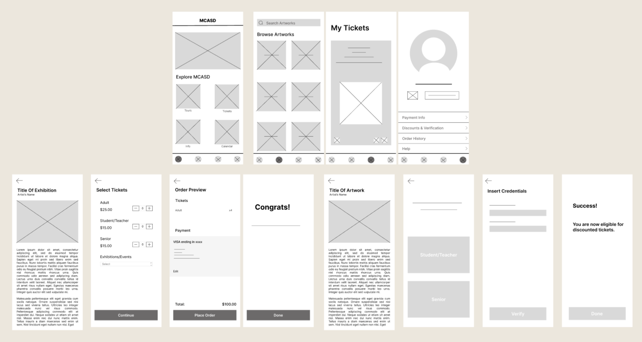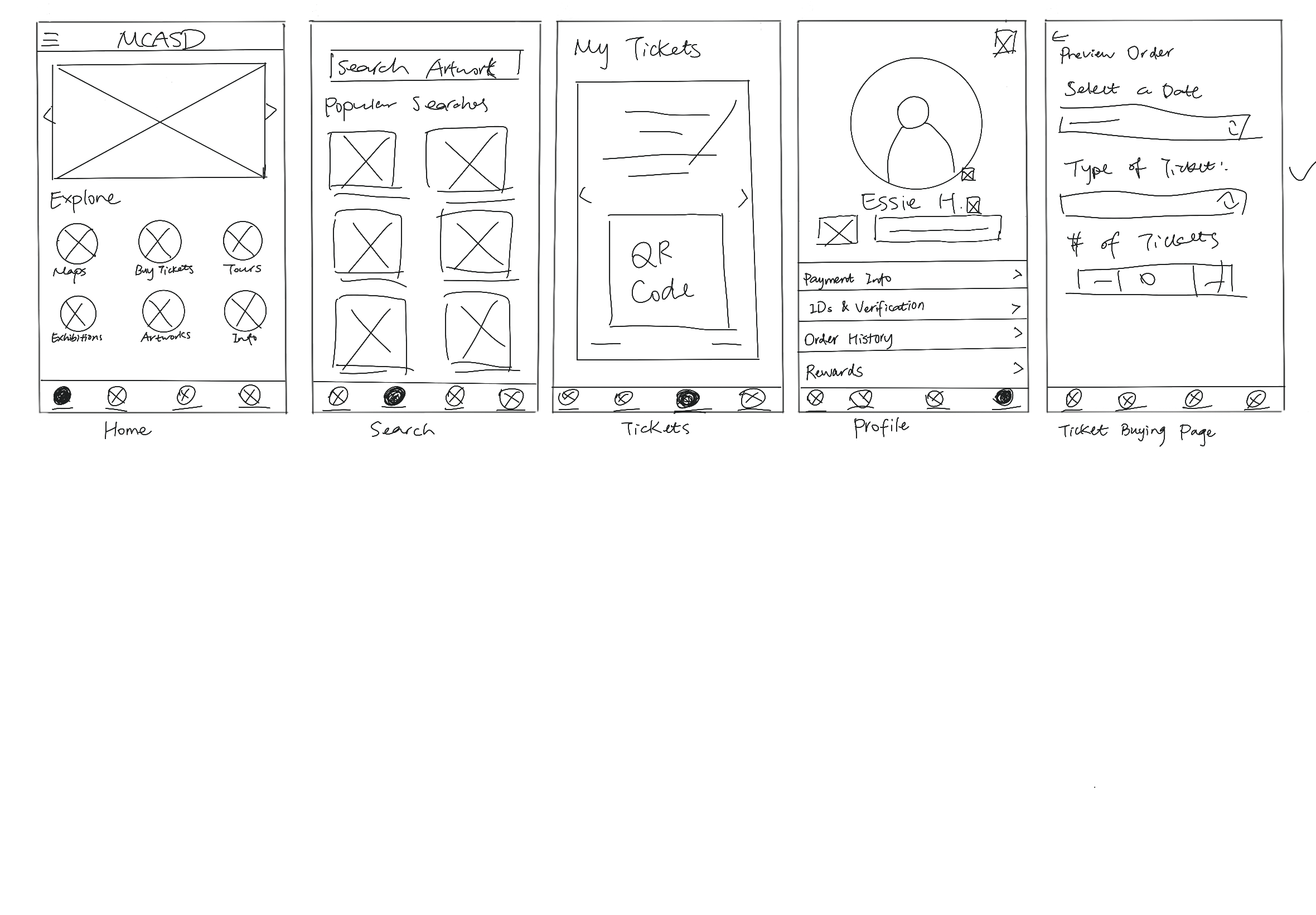 I've developed an interactive prototype for the app, incorporating a range of features to enhance user experience. Notable functionalities include an exhibition display on the home page for easy navigation, a seamless ticket scanning process, the ability to apply student and senior discounts effortlessly, and a comprehensive search function for exploring and learning more about artworks.