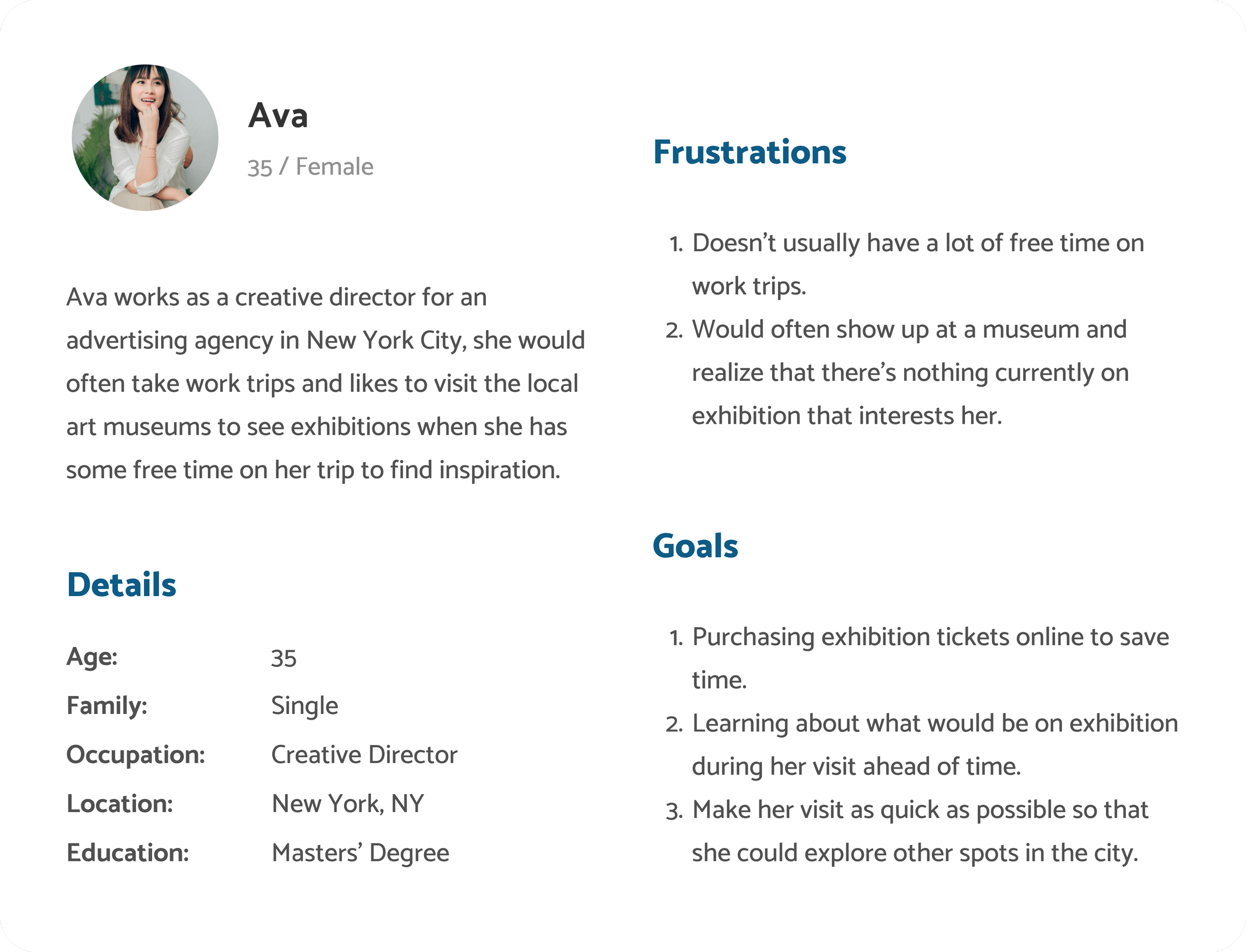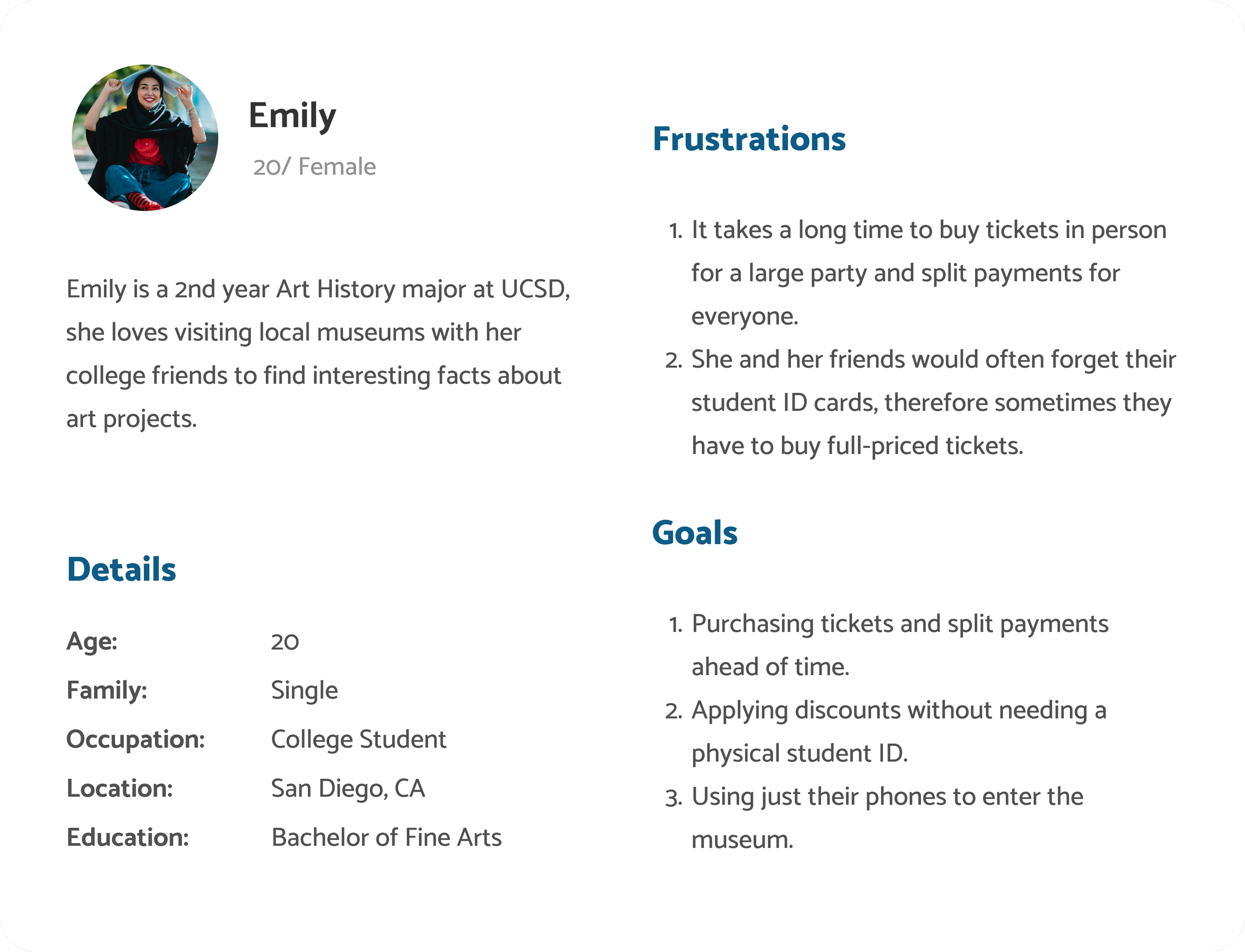 Through my interview findings, a common goal emerged among users who decide to download a museum's app: purchasing tickets, while many of them are looking to purchase discounted tickets. With this insight, I crafted personas tailored to my target audience – individuals actively seeking to purchase tickets online in advance of their museum visit.